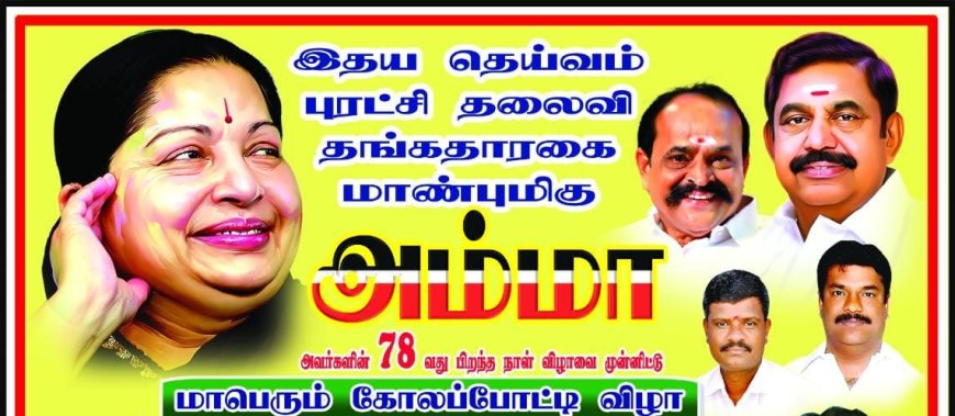 தூத்துக்குடி: மறைந்த தமிழக முதலமைச்சரும், அதிமுக முன்னாள் பொதுச்செயலாளருமான ஜெ. ஜெயலலிதா அவர்களின் 78வது பிறந்த நாள் விழாவை முன்னிட்டு எட்டையபுரம் பகுதியில் கோலப்போட்டி நடத்த அதிமுகவினர் திட்டமிடப்பட்டுள்ளனர்..